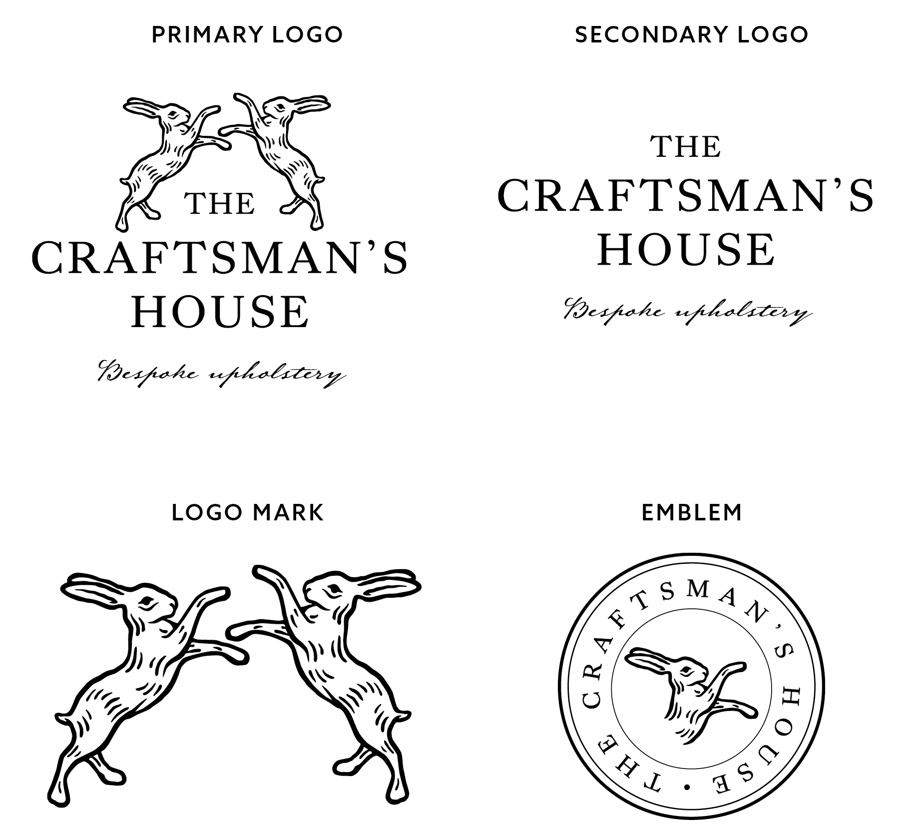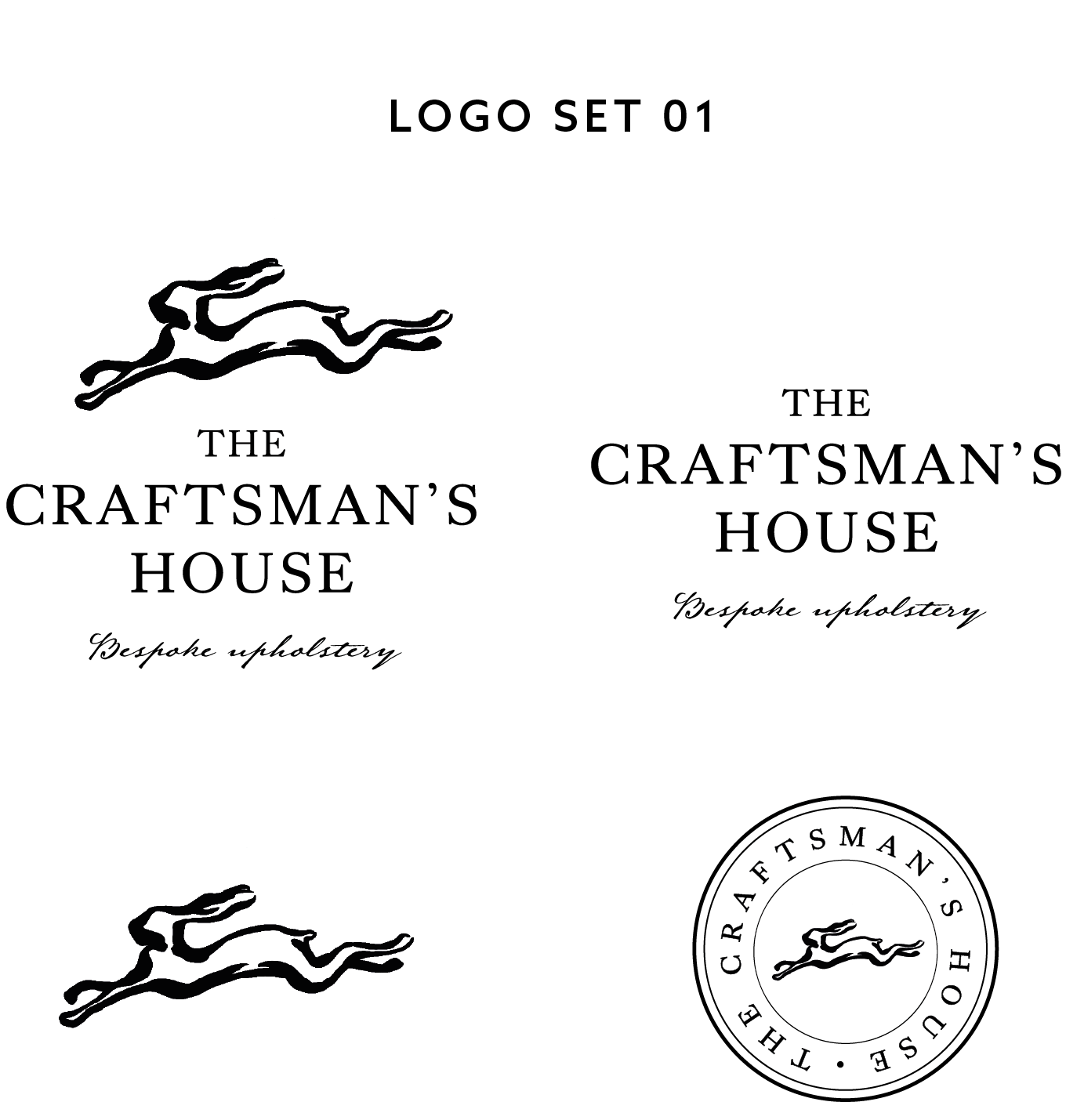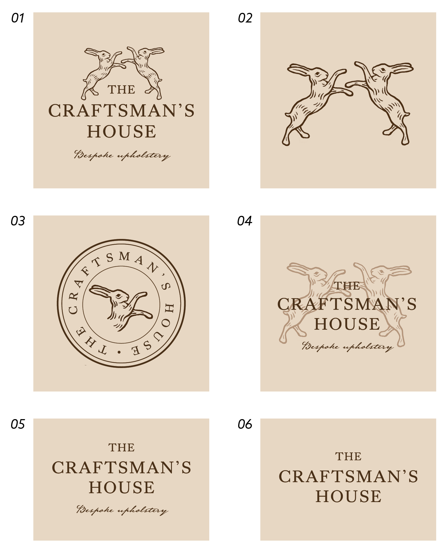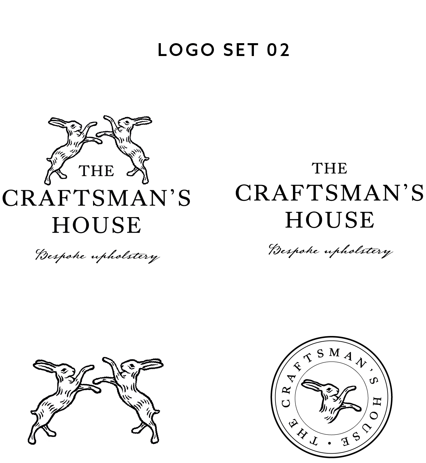 Revisiting the hare illustrations allow me to develop two distinct styles: one a looser, pen-like illustration (logo set 01), and the other a more traditional, line-based approach (logo set 02). In addition to the main logo, I experimented with a complementary emblem. By using circular borders, the designs mimic leathermaking stamps, which are closely linked to upholstery practices and reflect craftsmanship.