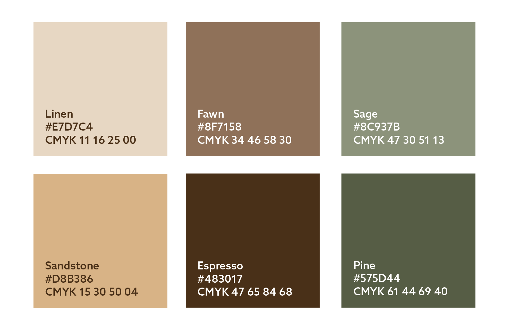 To support the logo set, various colour palettes were tested. The final colour palette includes mainly rich neutral brown shades, which convey a premium, classic brand, as opposed to a trend-led business. Moreover, the two subtle green tones in the palette reflect the brand’s focus on sustainability. Each colour in the final palette has sufficient contrast with black or white and can be combined with one another to offer additional flexibility.