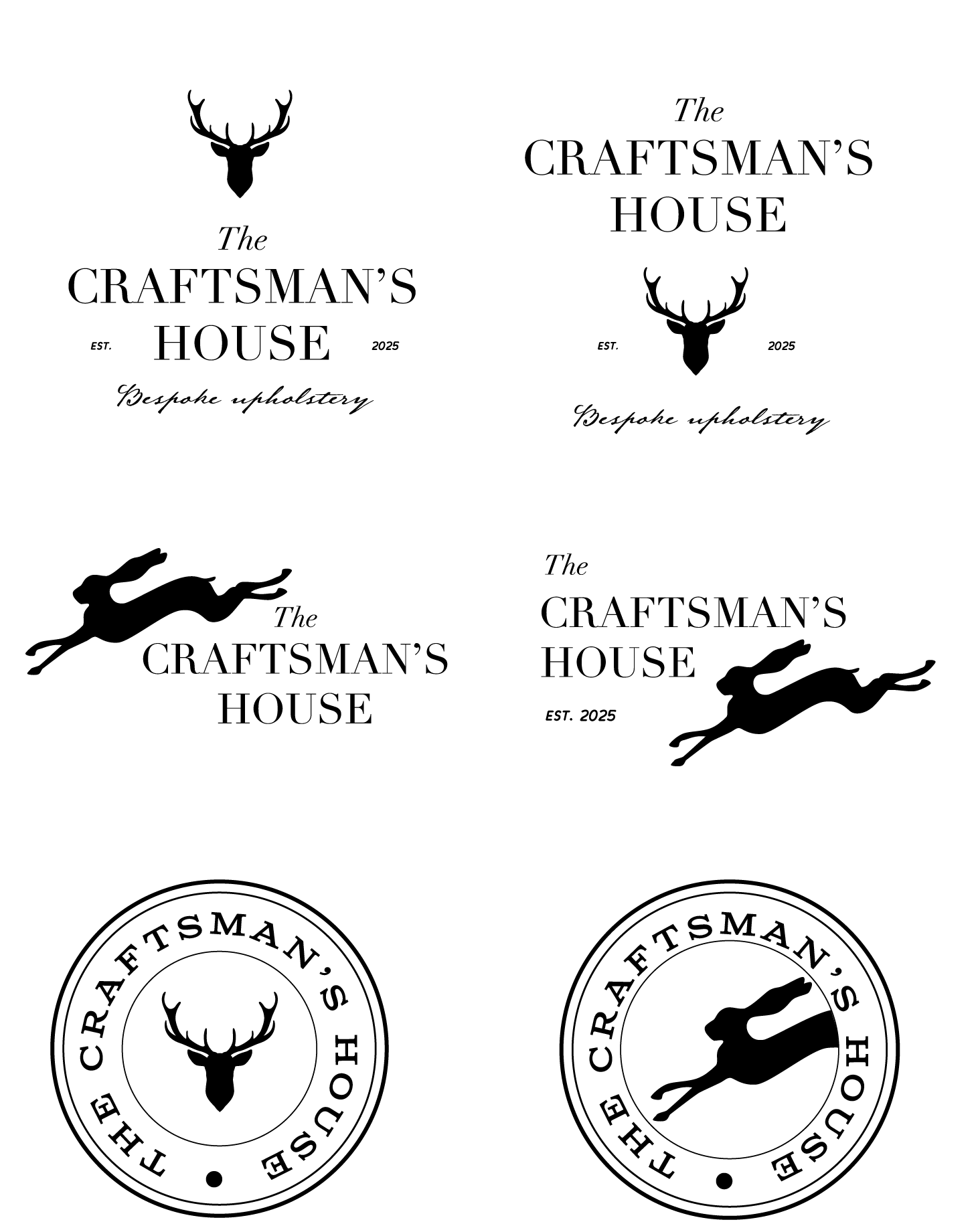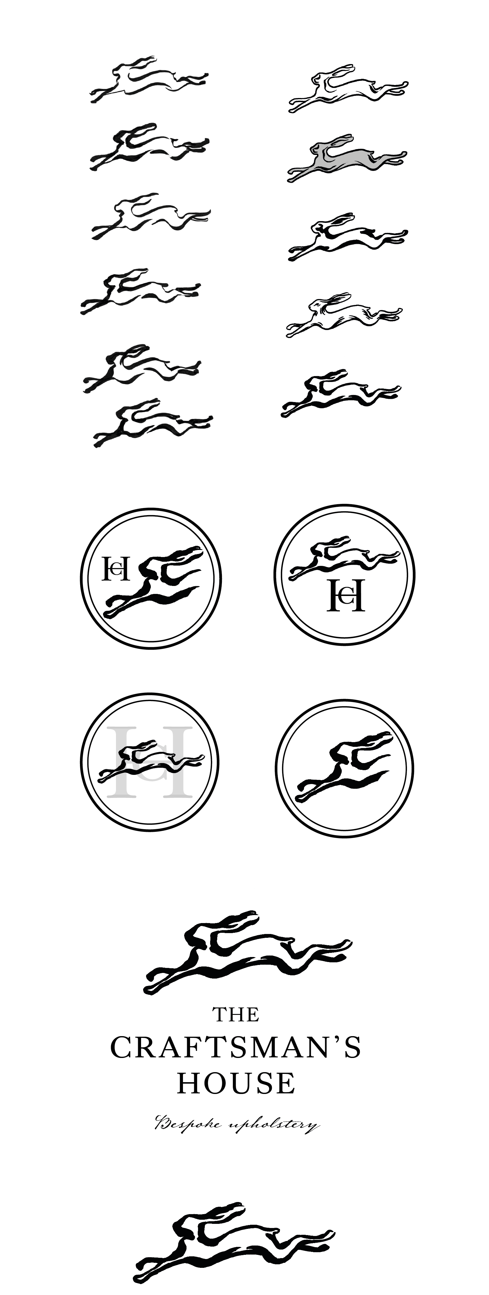 Matching the typography with an appropriate illustration proved more challenging, as vector logos (such as the deer and hare silhouettes below) proved too modern for the rustic style of the business. By contrast, my initial hand drawn illustrations of the door, lion door knocker, and upholstery scissors were too fine and presented legibility issues at small scales.