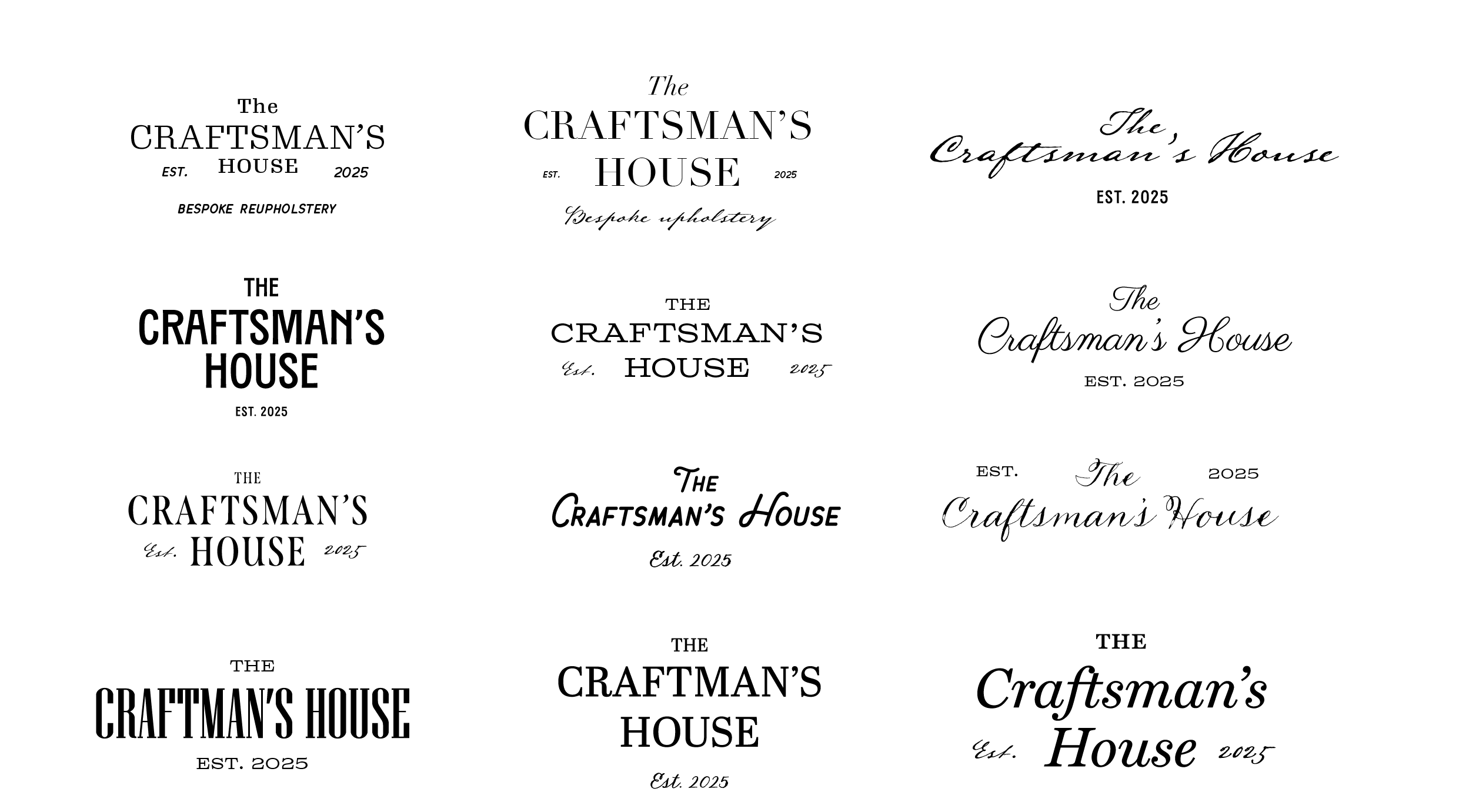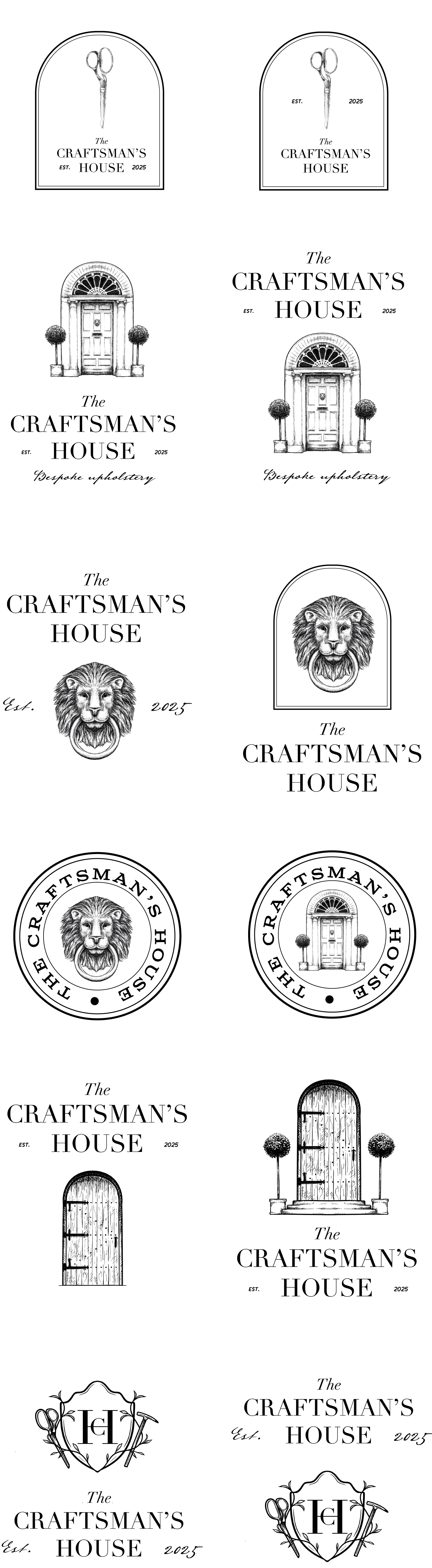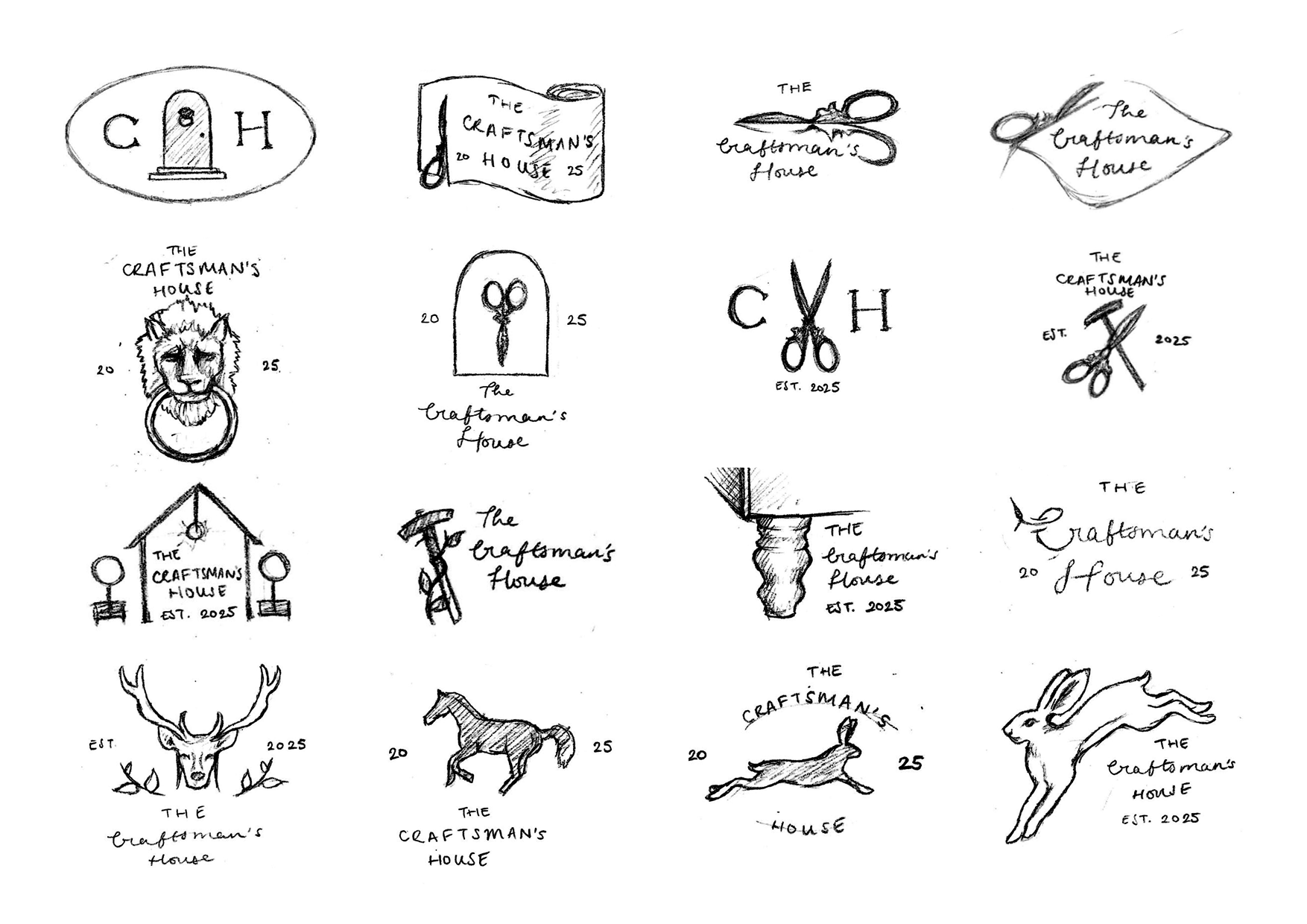 The initial sketches shown below expanded these concepts by experimenting with typographic combinations, vintage border styles, and hand-drawn illustrations. Some symbols referenced the eponymous ‘Craftsman’s House,’ through a house, door, door knockers, etc. Others included upholstery tools (scissors, tack hammer, etc) or signifiers of the business’ countryside location, such as deer and hares.