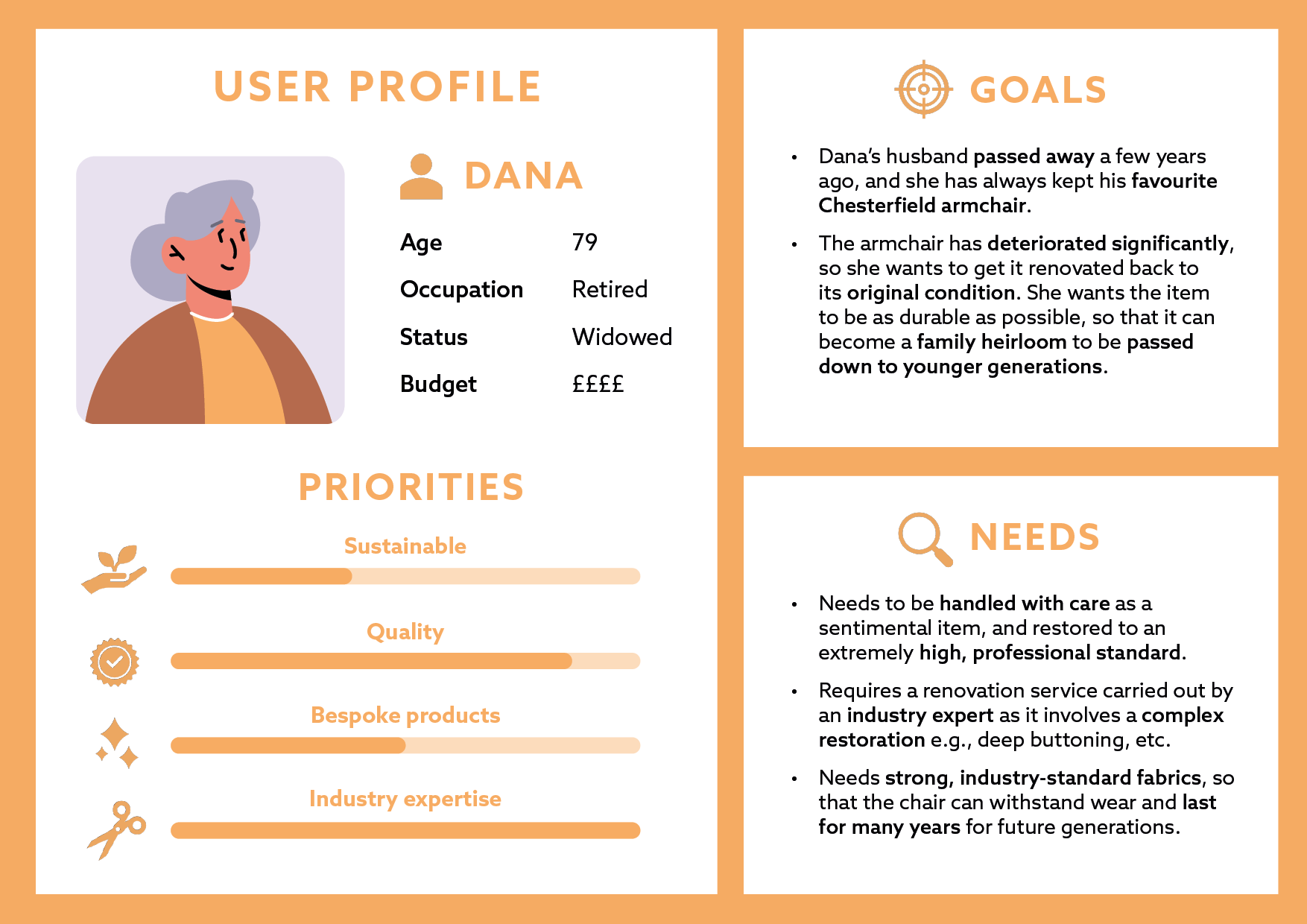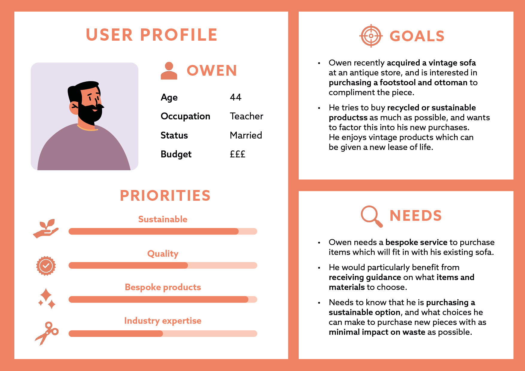To develop a visual strategy for the deliverables, user personas were created to represent potential customers. This process identified how the deliverables could respond to customer needs, such as emphasising the range of different services offered, the company’s unique products, and conveying their longstanding industry expertise.