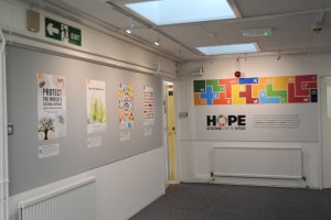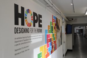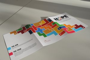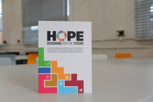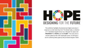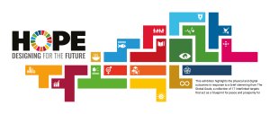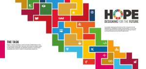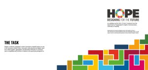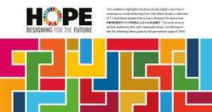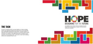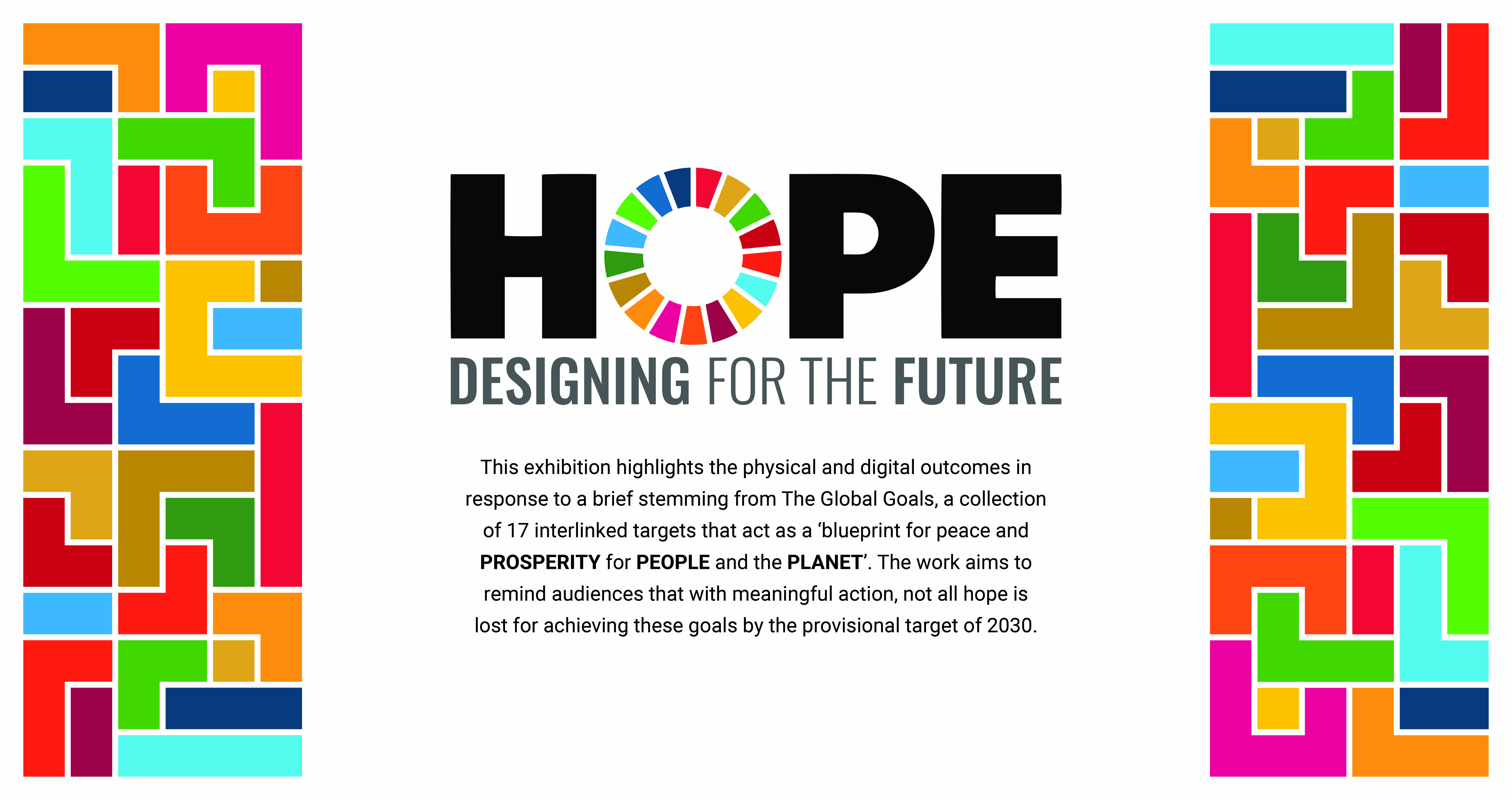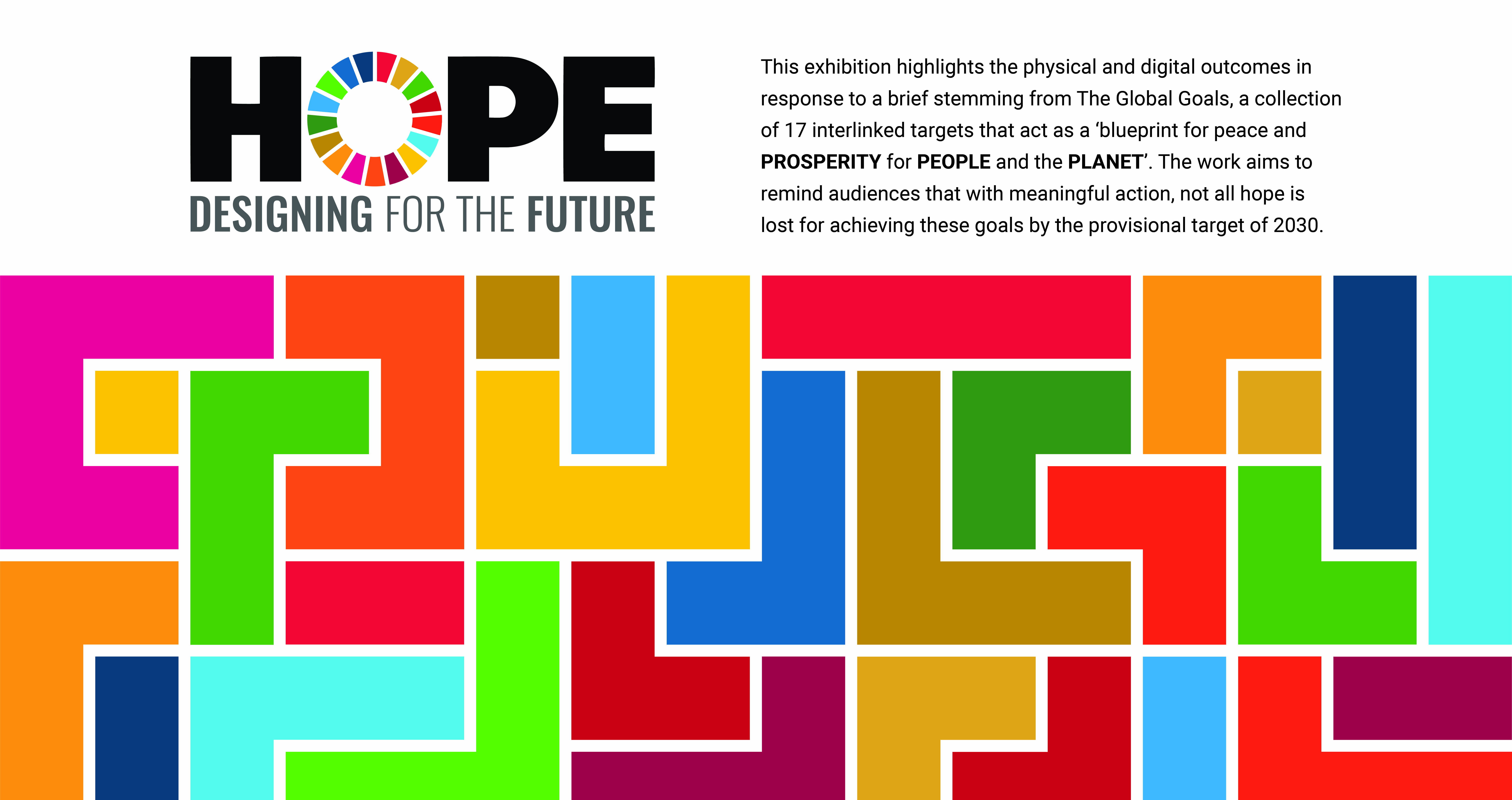The strongest concept was one that used the global goals colours within a tetris-based design of different blocks. Greg suggested we create a narrative for our concept that fits with the work that is showcased in the exhibition. This is when we came up with HOPE: Designing for the future. The tetris blocks shows everyone’s individual efforts, the students’ responses to the global goals, and when put together we can tackle all issues as part of a bigger community.