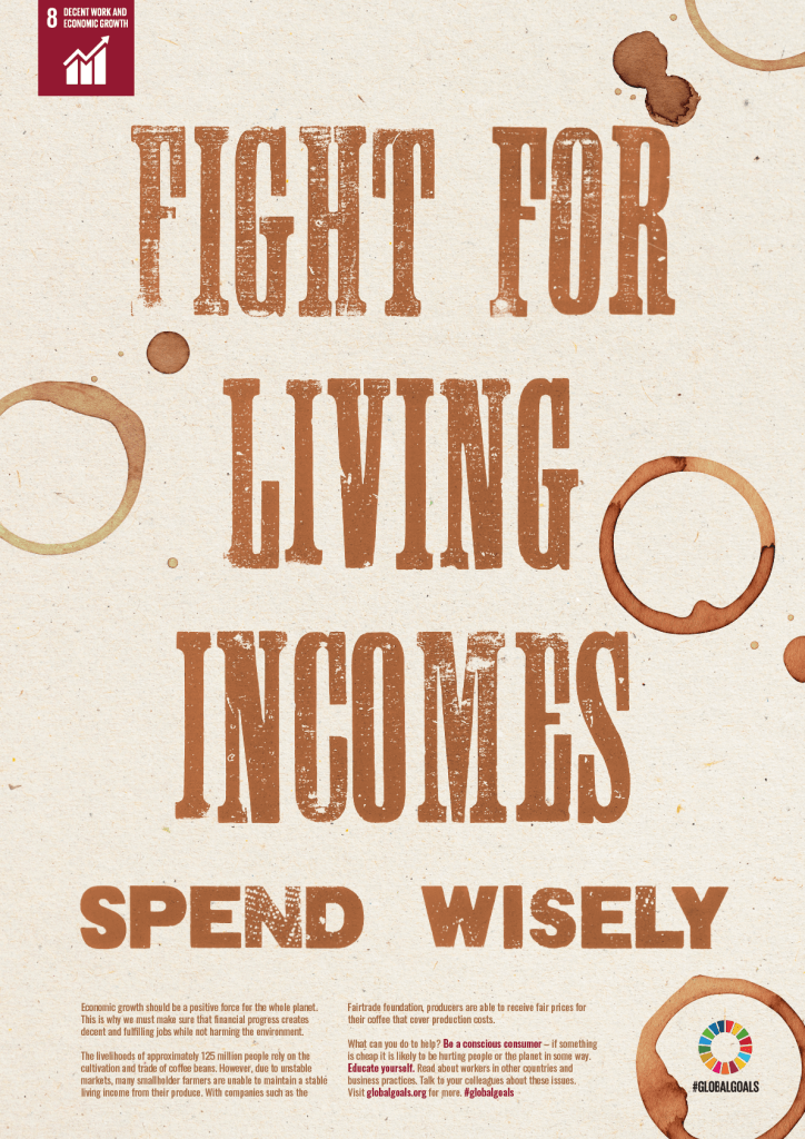The call to action in this poster promotes the fight for living incomes for coffee bean farmers. It encourages audiences to be conscious consumers and support brands that use ethically sourced produce, such as Fairtrade. The neutral colour palette is a reference to natural and organic farming methods and to the colour of coffee itself. Wood type has been used for the title as the process of letterpress printing requires manual labour, similarly to the cultivation of coffee beans.