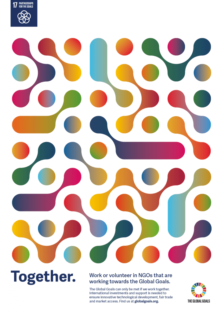 With the aim of strengthening global partnerships, this poster explores how the Global Goals are more effectively achieved when organisations and partnerships work together. Individual circles represent organisations, while the connecting nodes symbolises unity, something vital to the success of the Goals. The use of gradients and colours inspired by the seventeen Global Goals reinforces the idea that progress is only possible through collective effort.