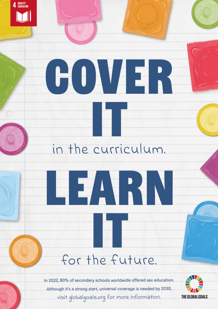 Promoting a call to action that strives to implement sex education in secondary schools, this outcome provides an inclusive approach to a stigmatising point of discussion. Vibrant, illustrated condoms are scattered over a page of lined paper. The large, typographic phrase provides a hopeful stance on the subject matter through double meaning and word play. With the addition of the handwritten type, it suggests that children are the ones impacted by the highlighted statistic.
