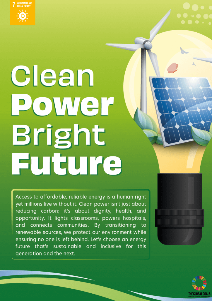 This design aims to raise awareness about the importance of accessible clean energy through a visually engaging and dynamic approach. Glowing typography and vector graphics symbolise the vibrancy and potential of sustainable energy. By incorporating movement and bold contrasts, the design mimics the flow and transmission of electricity, drawing attention to the urgency of energy challenges. This work communicates a clear message: clean power leads to a brighter, more equitable future for all.