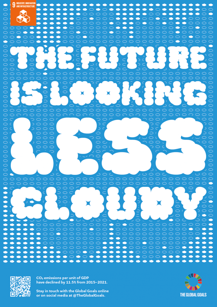 This outcome highlights the positive development towards Goal 9. A cloud pattern with the majority of the clouds being outlines, represents the CO2 in the atmosphere decreasing, meaning that there are less clouds in the sky. The type being in the shape of clouds emulates an artistic nature that aims to entice a younger audience into learning about the Global Goals.