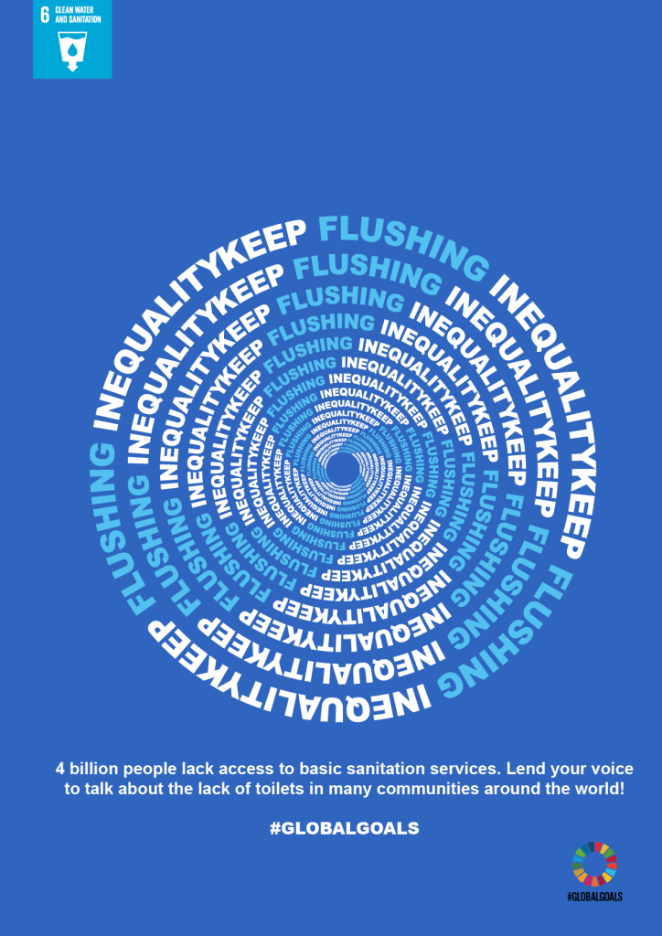 Highlighting the importance of global sanitation issues, this outcome provides a striking visual representation of flushing inequality through bold and impactful typography. The spiral motif, symbolising a toilet flushing, reinforces the powerful message of eliminating widespread, unequal access to basic sanitation facilities around the world.