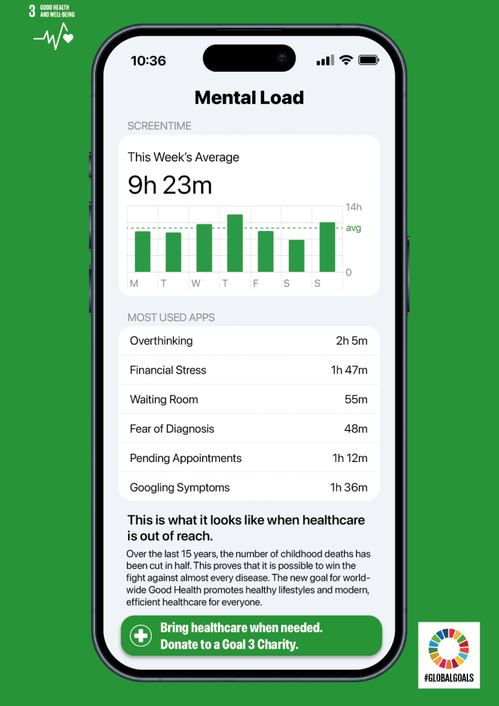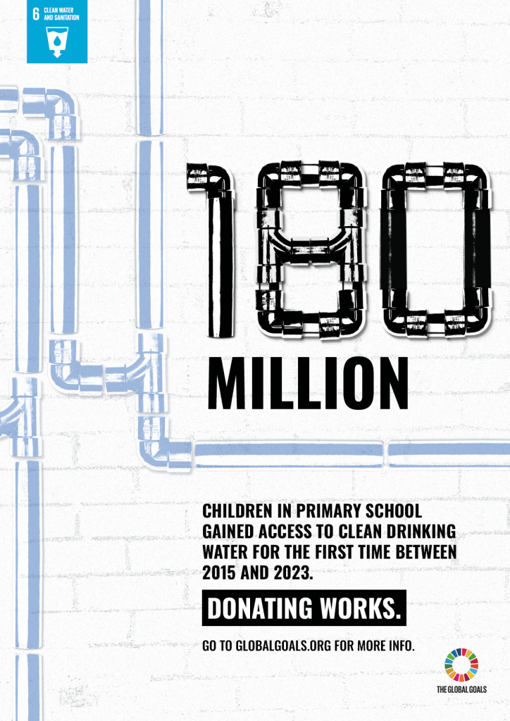 Echoing the theme of the 2025 Global Goals campaign, Be Hope, this outcome communicates a positive statistic from the realm of wash (water, sanitation and hygiene), a critical area of global health concern. The use of drainage pipework as lettering for the numerals arrests the viewer, and the design takes cues from 1970s protest posters to reuse elements in unexpected ways.