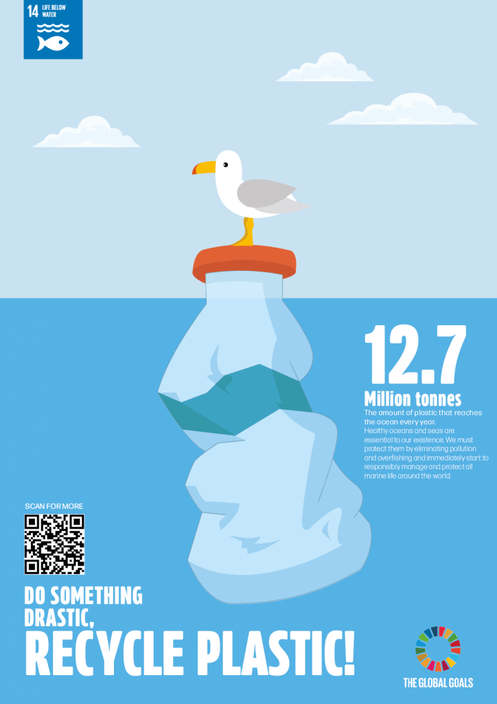 This poster encourages a call to action that seeks to improve life below water. The use of plastic waste imagery emphasises to the audience that global change needs to happen now. The visual elements of type and image work together to remind viewers that immediate action is needed to preserve our oceans and the ecosystems living in it.