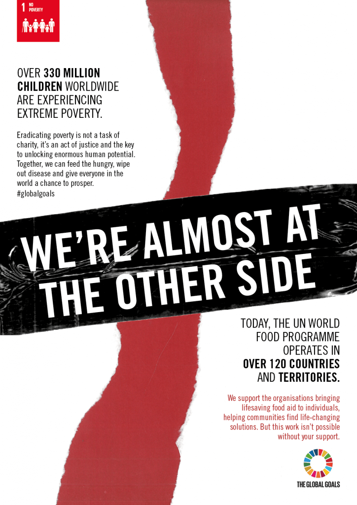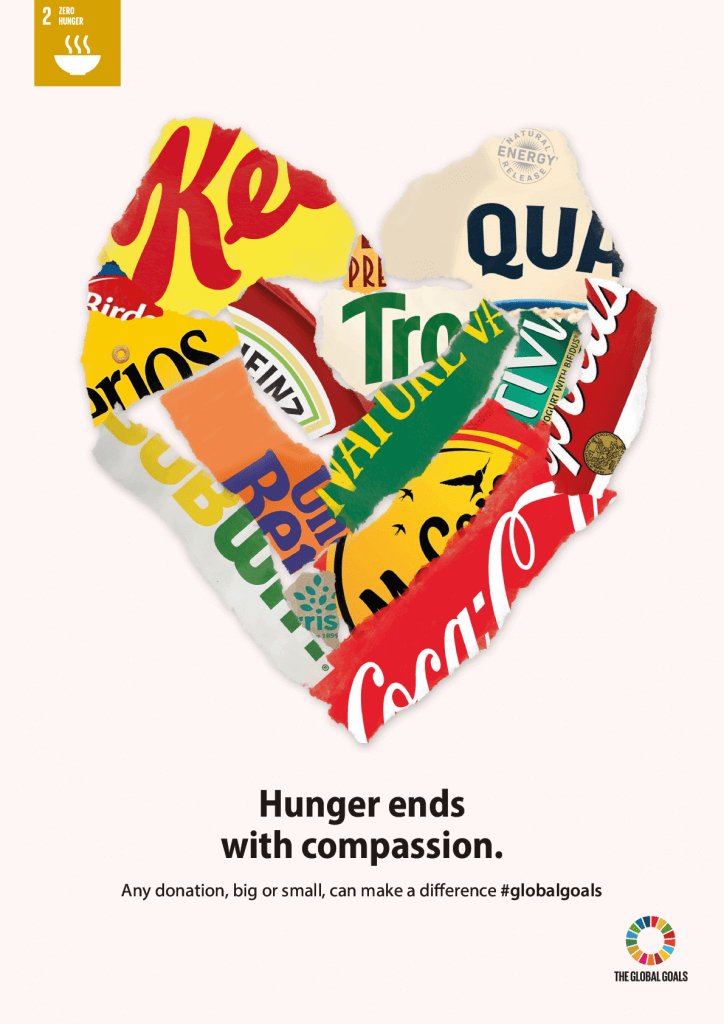 This poster shows the humanity behind the issue of hunger. The heart shape is universally associated with compassion and love. Forming a heart with familiar branded food packaging, it draws attention to the unseen people who don’t have access to these everyday items. It also shows that beneath systems of inequality that may lead to hunger, it is a deeply human experience. The ripped up packaging symbolises struggle, but the heart gives it emotional depth. This poster asks the viewer to respond emotionally rather than logically.