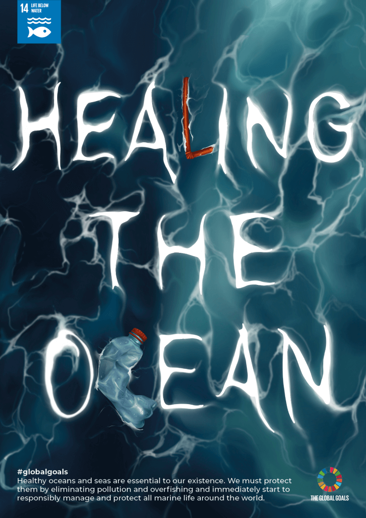 This poster emphasises the need to protect our oceans and marine life from plastic pollution. Using hand-drawn text, the phrase healing the ocean appears within the waves, symbolising how the health of marine life is deeply connected to human action. The two plastic items floating in the water represent everyday waste that harms oceanic ecosystems. The outcome encourages viewers to consider their own impact on the environment while conveying a hopeful message that with collective effort, global restoration of our oceans is still achievable.