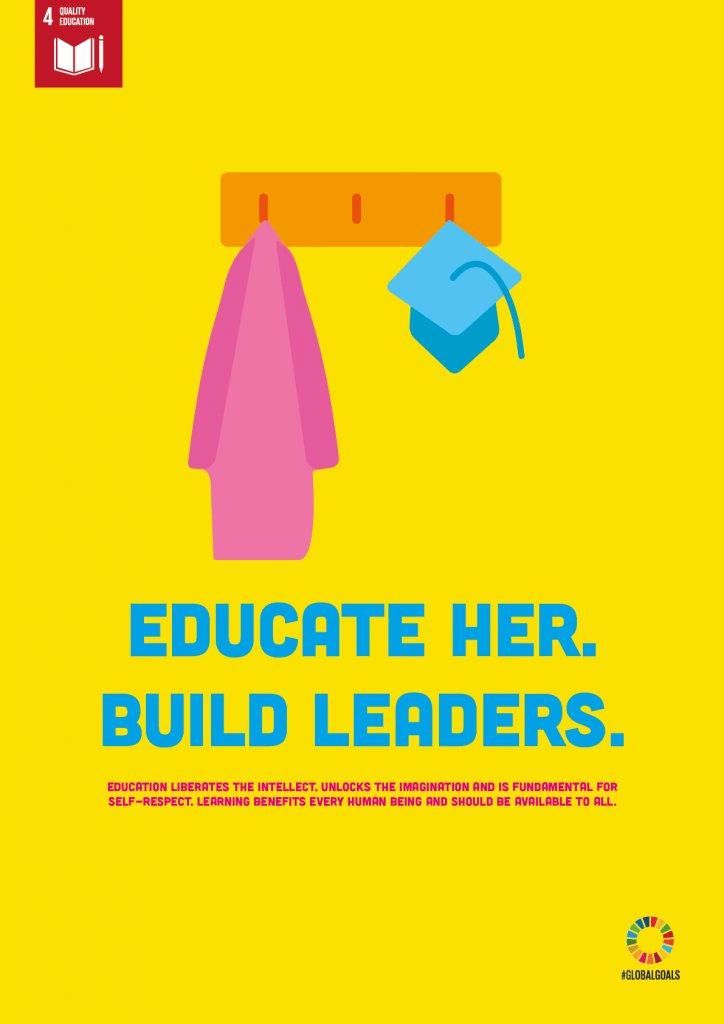 This poster was designed to communicate the importance of educating women as a pathway to leadership and business success. Using simplistic imagery of a blazer and graduation cap on wall hooks, the visual represents the journey from academic education to professional achievement. The bold, typographic phrase educate her. build leaders, reinforces the message that education is not only a right, but also a vital tool for empowerment and economic progress.