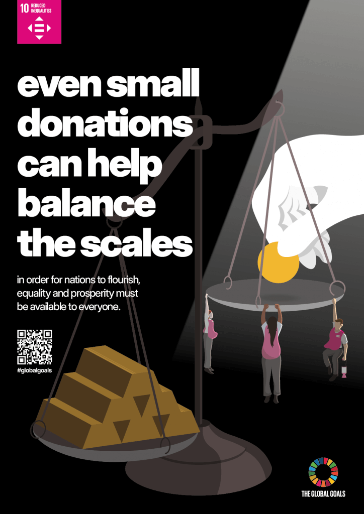 Unbalanced scales tell the story: corporate gold bars weigh down one side, while charity workers struggle to lift the other. A hand lowers a gold coin – small in size but shining brighter than the gold bars below – showing how even the smallest contribution can shift the balance. Lowercase, unadorned typography reinforces the power of quiet, individual action. The design invites reflection upon inequality and the potential for change through conscious, collective effort.