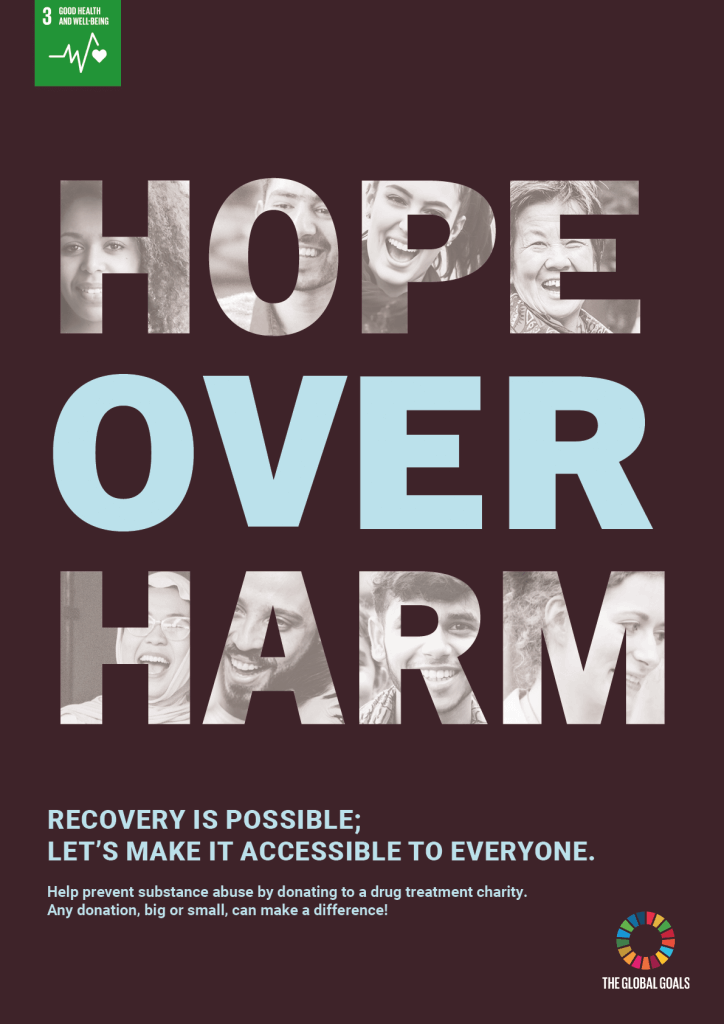 Raising awareness about substance abuse, in order to prevent it, was a key goal throughout the creative process. Prevention and treatment is highlighted through the phrase hope over harm, which aims to inspire the recovery journey of those affected by addiction. Typography combined with smiling faces inside the letters suggests that positive outcomes are possible when individuals are supplied with the right resources to recover. This message is reinforced through bold, sans-serif type to ensure clarity and impact.