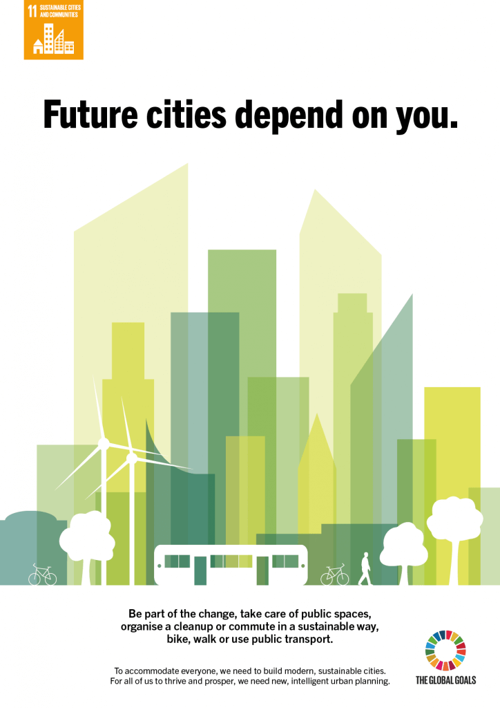 Inspiring students to collaborate and take an active role in shaping sustainable cities for the future, this poster shows their potential to influence urban planning, architecture and city development in their careers. The vibrant city is made up of modern buildings, renewable energy sources, public transport and trees reflecting the kind of sustainable urban environments we should strive to create. The title motivates and empowers viewers to prioritise sustainability, both in their daily lives and future careers.