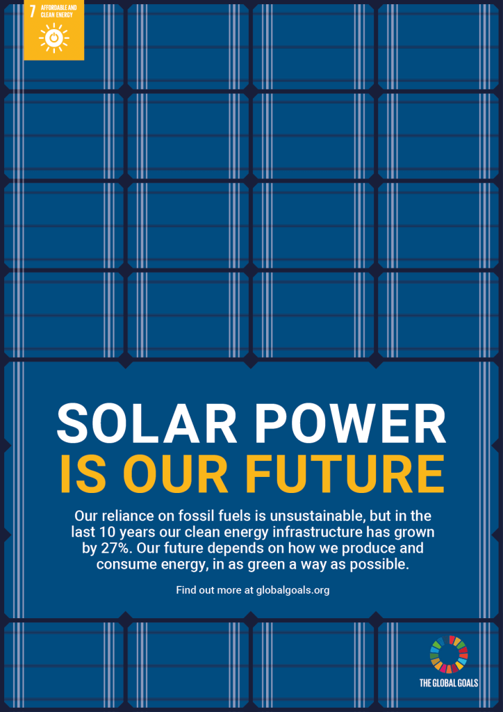 This poster celebrates solar power, highlighting it as the key to achieving clean and affordable energy across the globe. Featuring a striking solar panel and the hopeful statement solar power is our future, the design encourages urgent action toward sustainable innovation. The vibrant, forward-looking aesthetic reinforces the message that renewable energy is essential for building a cleaner, more equitable world.