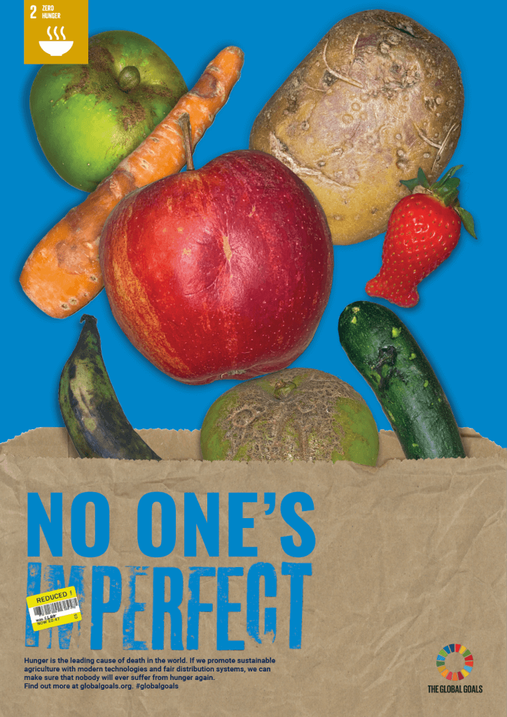 Wonky fruit falling into a brown paper bag, symbolising the urgent call to choose and celebrate imperfect produce. The design challenges the idea that food has to look perfect to attract people to buy it. Choosing this alternative means we take a simple, but powerful step towards reducing food waste and zero hunger, because perfectly good fruit shouldn’t go to waste just for how it looks.