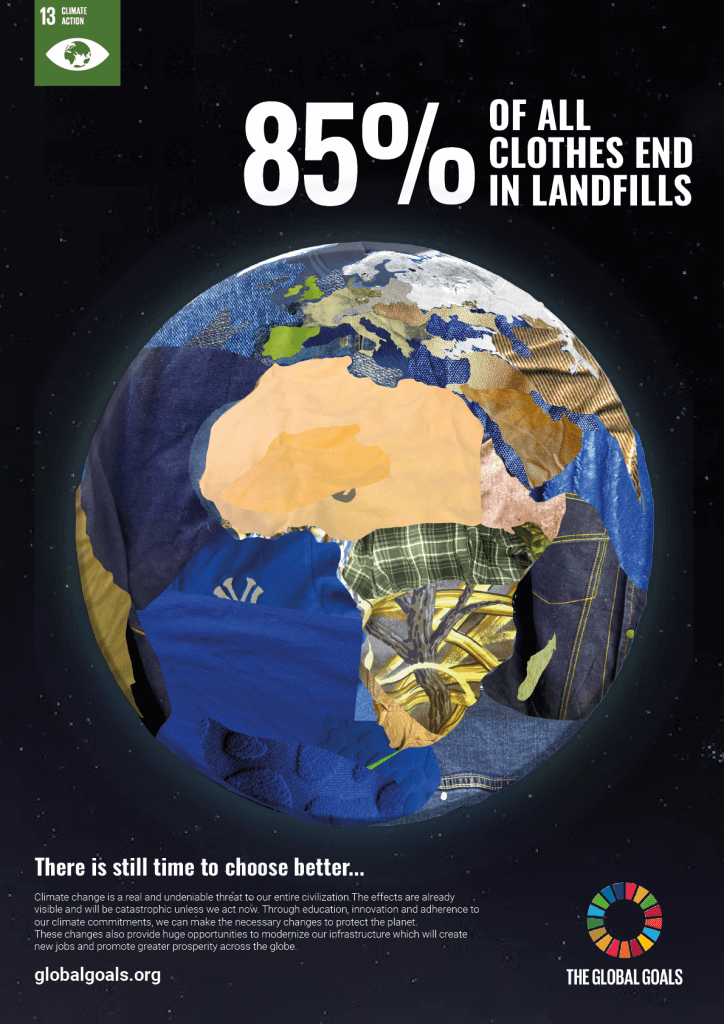Tackling climate change through the lens of fast fashion, this poster utilises a striking visual of Earth wrapped in abandoned textiles to highlight the weight of overconsumption. A muted palette and simple language keep the message clear and accessible. The phrase there is still time to choose better emphasises optimism and encourages action. By embedding the planet in familiar materials, the design makes the environmental impact of fashion feel personal and urgent.