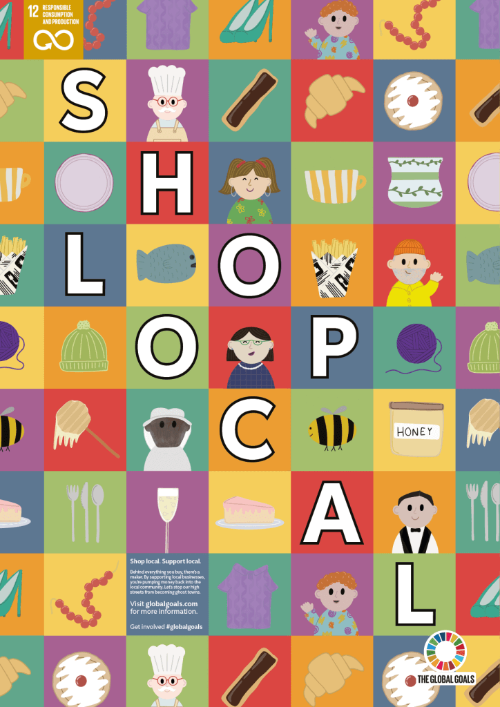 Focusing on the small things that make a big difference, this poster highlights the importance of shopping locally, and not supporting large corporations and companies. The hand-illustrated characters and icons convey a friendly message, making it more approachable to a wider audience. The block sans-serif used for the typographic slogan shop local is used to complement, but also stand out against the colourful grid.