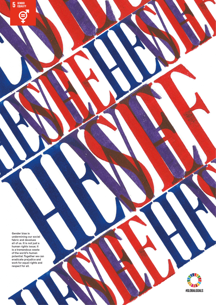 The pronouns he, she and we have been printed using letterpress technologies, with unity symbolised through overprinting we on top of he and she. The colour palette is purposeful: red represents the goal being designed for, and purple, used in we, signifies inclusivity and is often associated with International Women’s Day. Since red and blue combine to make purple, blue was chosen as the third colour to reinforce the idea of coming together. Collectively, the palette and typography highlight a unified society working towards global gender equality.