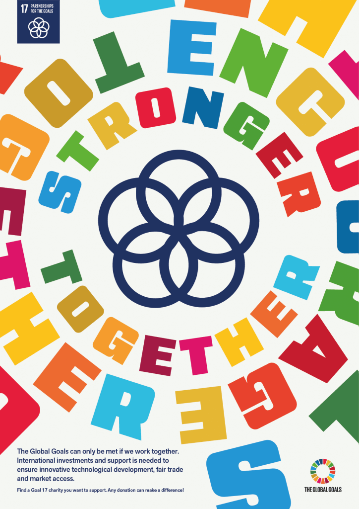 This outcome highlights the importance of people and organisations working together. Bold lettering composed in circles is used to draw attention and create impact, reflecting the urgency and significance of global collaboration. Each letter represents a different Global Goal by its colour, showing how progress across all of the Goals is connected. The logo for Goal 17 sits at the centre of the page as an anchor point, showing how partnerships bring the goals together.