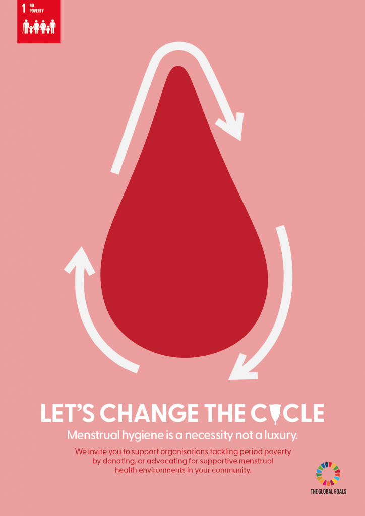 This poster raises awareness about period poverty while challenging related stigmas. Inspired by the recycling symbol, the arrowed blood droplet represents support for accessible, reusable menstrual products, highlighting the need to break the cycle of poverty. Typography, such as a menstrual cup replacing the letter T, reinforces the focus on sustainability. A bold yet feminine colour palette, especially the use of red, symbolises menstrual blood and reimagines it as something empowering, rather than shameful.